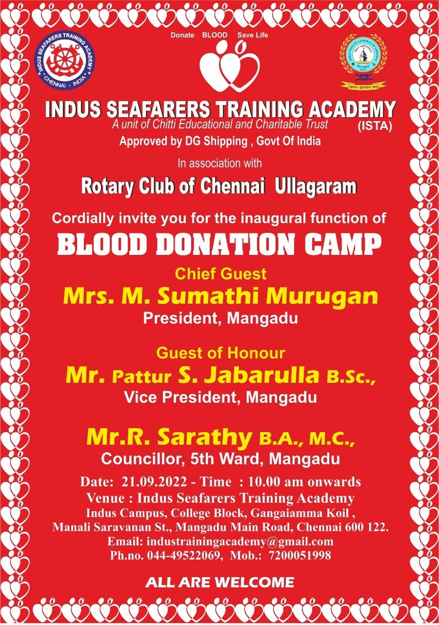 Indus seafarers training academy has conducted blood donation camp at the campus for all trainees and the management on 21st September 2022
